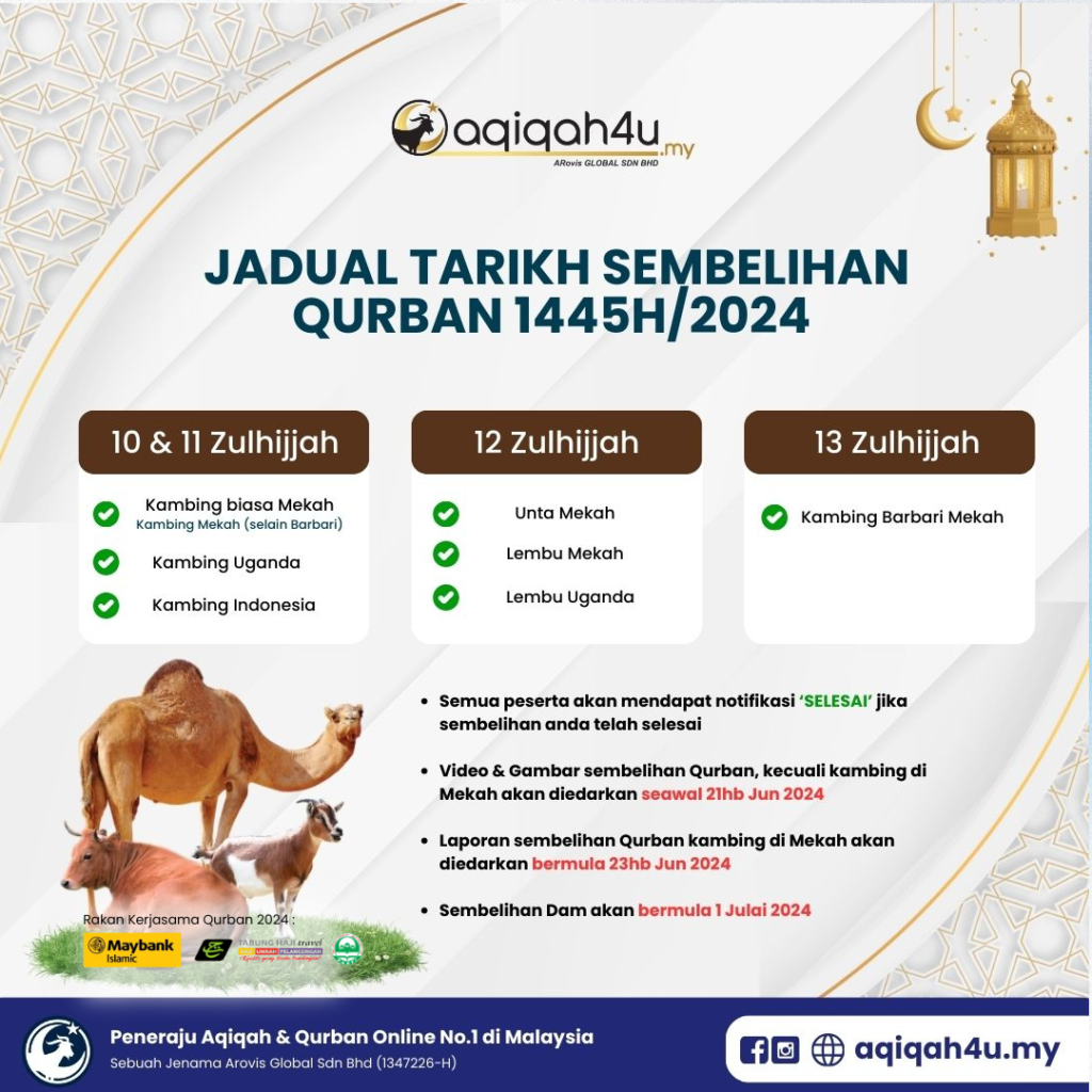 - Laporan sembelihan (Laporan Umum) Qurban kambing di Mekah akan diedarkan bermula 23hb Jun 2024 – Notifikasi melalui SMS, Whatsapp dan Emel.